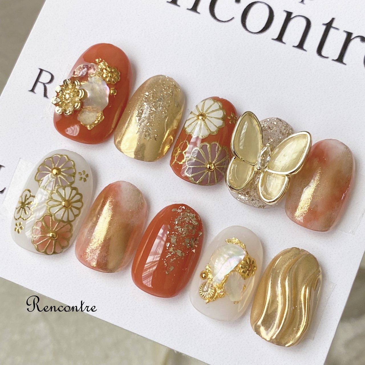 どんなカラーのどんなデザインの振袖にも間違いなく合うのが、和柄ネイル🥰 ネイル初心者さんにはぴったりのデザインだよ ただ和柄ネイルは普段のコーデにはちょっぴりミスマッチだから、ネイルチップにするのがおすすめ💕 ネイルチップなら何度でも使えるから、前撮りや後撮りのときも使えるのが嬉しい💅🏻 みんなの和柄ネイルをチェックしてみよう! 次は、最近おすすめの振袖ネイルを3つ紹介します。 1つ目は、非和柄ネイルです。 ネイルを作ったことがある方なら分かると思いますが、力を入れて作ったネイルをすぐに剥がすのはもったいないと感じるでしょう。 一度しかない成人式であれば、なおさらもったいないと感じます。